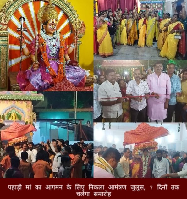 इस अवसर पर लोको कॉलोनी स्थित पहाड़ी मंदिर प्रांगण में दक्षिण भारतीय महिलाएं इस पूजन में बढ़ चढ़कर हिस्सा लिया। महिलाएं सुबह गोलपहाड़ी में अवस्थित पहाड़ी मां को आमंत्रण देने के बाद शाम में बड़ी संख्या में भक्तगण गाजे बाजे के साथ गोल पहाड़ी मंदिर पहुंचें, जहां घंटों पूजन और मां का आशीर्वाद मिलने पर उन्हें लेकर पुनः लोको मंदिर प्रांगण पहुंचेंगे। बताया जाता है कि पूजन से खुश होने पर मां फूल गिराकर आशीर्वाद के रूप में अनुमति प्रदान करती है।इसके बाद एक से पांच मई तक प्रत्येक दिन एक अलग रूप में श्रृंगार कर पूजन होगी और शाम 7:00 बजे नगर भ्रमण के लिए निकलेंगे इस नगर भ्रमण का खासियत यह होती है कि इसमें सिर्फ महिला ही मौजूद रहती है। वही 6 अप्रैल को मां का विदाई समारोह होगा।मान्यता है कि मां ग्वाला परिवार में जन्मी थी एक दिन पशुओं को चराने के लिए पहाड़ पर गई फिर वापस नहीं लौटी, दूसरे दिन ग्रामीणों ने मां को पत्थर के रूप में पाया तब से मां पहाड़ी के नाम से पूजी जाती है। इनकी पूजा से परिवार में सुख शांति कायम रहती है।