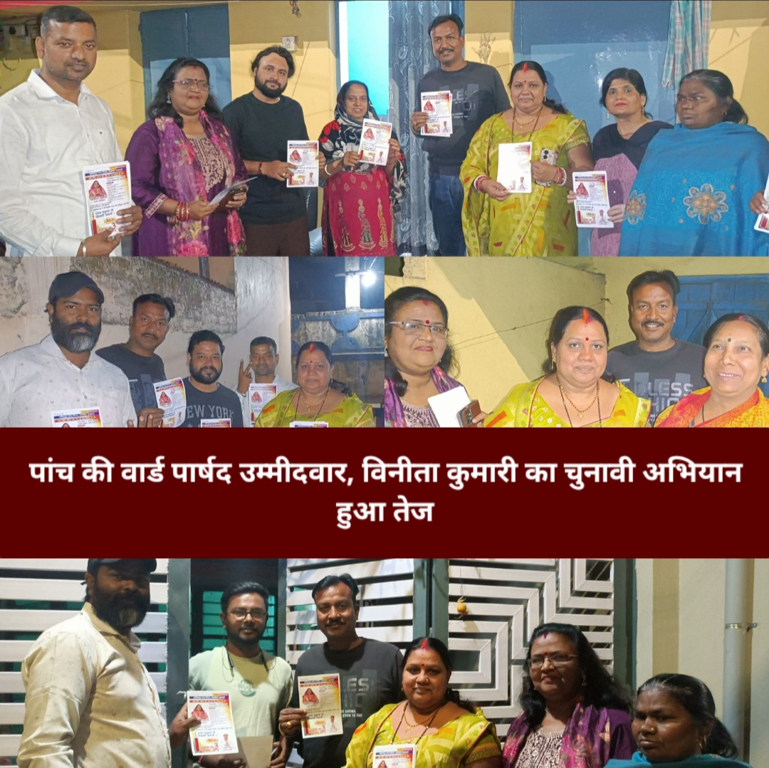 सरायकेला : आदित्यपुर नगर निगम के वार्ड नंबर 5 के लोकप्रिय उम्मीदवार विनीता कुमारी ने अपनी समर्थकों के साथ चुनावी अभियान तेज कर दिया है। घर-घर जाकर लोगों से आशीर्वाद मांगा और जीताने की अपील की। वही जनता ने भी जीत की आशीर्वाद दी।