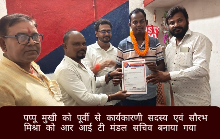 जिसमें मुख्य रुप से पप्पू मुखी को जमशेदपुर पूर्वी से कार्यकारणी सदस्य नियुक्त किया गया एवं सौरभ मिश्रा को आदित्यपुर 02 अंतर्गत आर आई टी मंडल से सचिव पद पर नियुक्ति पत्र दिया गया. इस अवसर पर जिला सचिव बिट्टू ऊर्फ सत्य प्रकाश राय, आर आई टी मंडल उपाध्यक्ष रमेश ठाकुर, मंडल उपाध्यक्ष दिनेश प्रधान, वरिष्ठ समाजसेवी फातु दा, समाजसेवी के राजु उपस्थित थे.