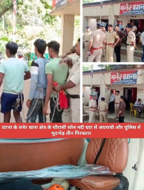 पटना : पटना के मनेर थाना क्षेत्र के चौरासी सोन नदी घाट के पास पुलिस और अपराधियों के बीच मुठभेड़ हुई। मुठभेड़ के दौरान दोनों तरफ से भारी गोलीबारी हुई। इस मुठभेड़ में पुलिस ने तीन अपराधियों को गिरफ्तार किया है जो भोजपुर के आरा जिले के सुरोंधा इलाके के बताए जा रहे हैं। ये अपराधी सोन नदी के किनारे नाविकों से रंगदारी वसूली करते थे। पुलिस को गुप्त सूचना मिली थी कि ये अपराधी अवैध रूप से बालू माफिया से जुड़े हैं और नदी किनारे रंगदारी वसूलते थे।