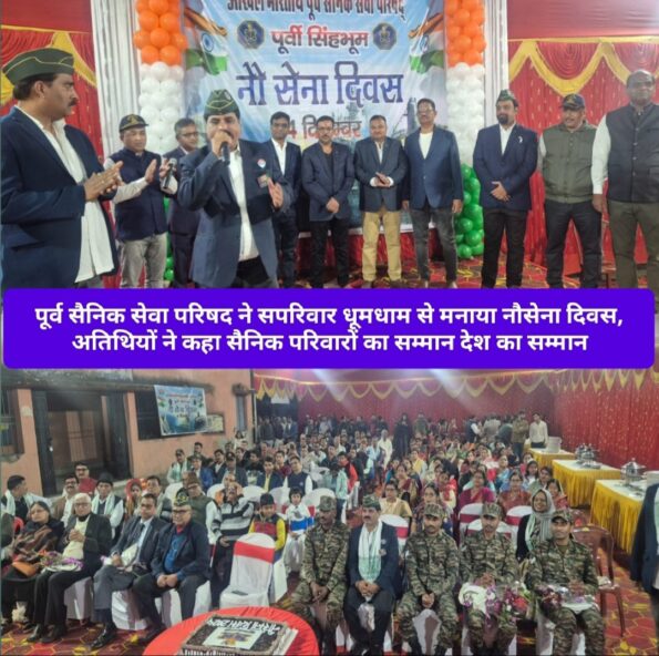 सरायकेला / (संजीव मेहता) : हर वर्ष की भांति इस वर्ष भी तीनों सेना से सेवानिवृत सैनिकों ने नौ सेना दिवस धूमधाम से मनाया. इस अवसर पर मुख्य अतिथि के रूप में सोनारी आर्मी यूनिट के कमांडिंग ऑफिसर के प्रतिनिधि के तौर पर लेफ्टिनेंट आदिती यादव एवं वीर जवानों के साथ-साथ ब्रिगेडियर रणविजय सिंह कर्नल राजन अय्यर (अवकाश प्राप्त) हिमांशु सेठ अतिथि के रूप में शामिल हुए. नौ सैनिकों को उनकी पत्नीयों समेत अतिथियों ने सम्मानित किया. नौसेना दिवस का केक बृजकिशोर सिंह, सचिव दिनेश सिंह, सुशील कुमार सिंह, राजीव रंजन, मनोज ठाकुर, हरेन्दू शर्मा, अमित कुमार, अनुज सिंह, मिथिलेश सिंह, ओमेंद्र मुनार, रणजीत दिलीप सिंह, कमलबश ठाकुर, अनुभव सिंह ने अतिथियों के साथ मिलकर काटा. सैनिक परिवार के बच्चों ने नृत्य और गीत का प्रस्तुति दी, जबकि मुख्य अतिथि ने इतने सारे परिवार को इकट्ठे एक मंच पर देखकर बहुत प्रसन्न हुए एवं कहा की आगे भी सैनिक एकता बनी रहनी चाहिए. उन्होंने कहा कि आप सब संगठित होकर समाज के विभिन्न क्षेत्र में सहयोग करते रहे इससे समाज में सैनिकों का सम्मान बढ़ेगा. कमोडोर की बेटी लेफ्टिनेंट आदिती यादव ने अपने सम्बोधन में कहा कि सेवानिवृति के बाद भी आप सब सैनिक इतने सक्रिय हैं यह देखकर बहुत खुशी हो रही है, प्रायः सेवानिवृति के लोग सिविल समाज आकर सुस्त पड़ जाते हैं।