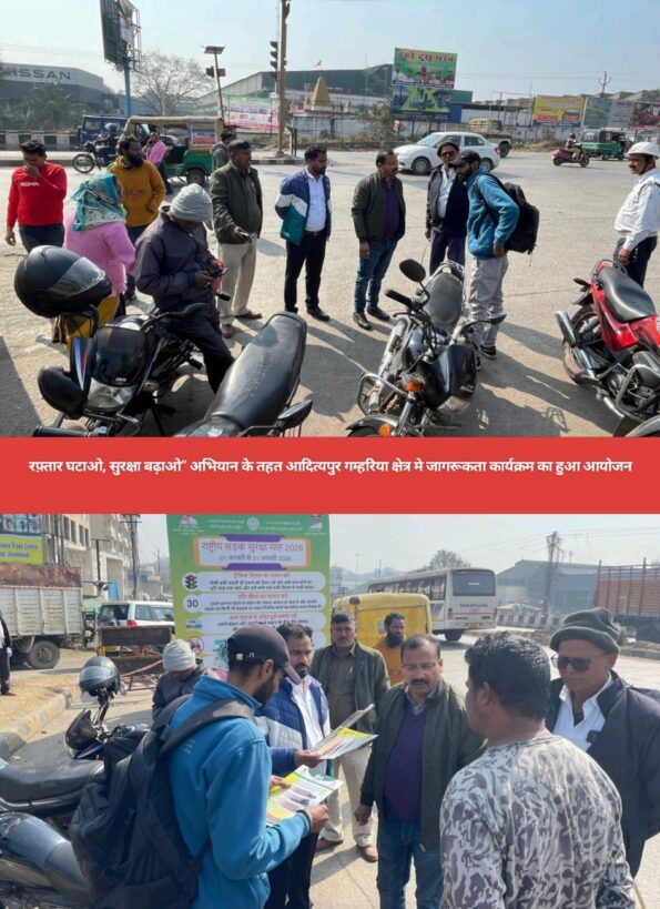 Saraikela (संजीव मेहता) : राष्ट्रीय सड़क सुरक्षा माह–2026 के अंतर्गत “रफ़्तार घटाओ, सुरक्षा बढ़ाओ” अभियान के तहत जिला परिवहन पदाधिकारी, सरायकेला–खरसावाँ की उपस्थिति में आदित्यपुर क्षेत्र अंतर्गत ऑटो क्लस्टर में सड़क सुरक्षा जागरूकता कार्यक्रम का आयोजन किया गया. कार्यक्रम के दौरान सड़क सुरक्षा टीम द्वारा दोपहिया एवं चारपहिया वाहन चालकों को ओवरस्पीडिंग न करने की अपील की गई. साथ ही, ओवरस्पीडिंग के कारण होने वाली सड़क दुर्घटनाओं से अवगत कराते हुए वाहन चालकों के बीच पम्पलेट का वितरण किया गया.