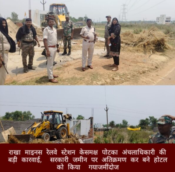 जादूगोड़ा :राखा माइनस रेलवे स्टेशन के समक्ष पोटका अंचलाधिकारी निकिता बाला ने आज शनिवार को बड़ी कारवाई करते हुए सरकारी जमीन बने अतिक्रमण कर शिशिर पात्रों द्वारा बनाए गए अवैध होटल को जमींदोज कर दिया।इस मौके पर इंस्पेक्टर सुरेश प्रसाद, थाना प्रभारी राजेश कुमार मंडल सशस्त्र बल के साथ मौजूद थे।