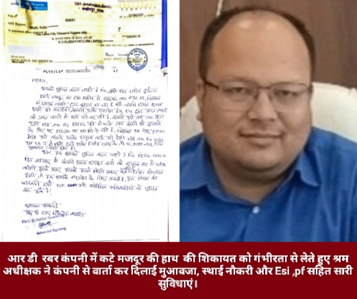 कंपनी द्वारा इस प्रकार से लिखकर दिया गया है। यह आपको सूचित करते हुए खेद हो रहा है कि बीते दिन एक दुर्भाग्यपूर्ण दुर्घटना में हमारी कंपनी के एक मजदूर का हाथ मशीन में फँस जाने के कारण गंभीर रूप से कट गया। कंपनी ने तत्क्षण उसका इलाज शुरू कराया और भविष्य में भी संपूर्ण चिकित्सा व्यय का वहन करेगी। साथ ही, कर्मचारी राज्य बीमा (ESI) योजना के अंतर्गत मिलने वाली सहायता प्राप्त करने की प्रक्रिया भी कंपनी द्वारा की जा रही है। कंपनी उस मजदूर को पूर्ण स्वस्थ होने तक नियमित वेतन देती रहेगी। इसके अतिरिक्त, मुआवजे के रूप में ₹2,50,000 (डीडी नंबर – 699261) की धनराशि प्रदान की जा रही है। कंपनी उसे उसकी शारीरिक स्थिति के अनुरूप कार्य भी प्रदान करेगी जब तक कि वह 58 वर्ष की आयु तक कार्यरत रह सके। इसके अतिरिक्त, उसकी तात्कालिक आवश्यकताओं को देखते हुए ₹25,000 की नगद सहायता पहले ही दी जा चुकी है। हम आपको सूचित करना चाहते हैं कि दिनांक 14.06.25, शनिवार से कंपनी अपने उत्पादन कार्य को पुनः सुचारु रूप से प्रारंभ करने जा रही है। यदि इसमें आपके किसी प्रकार के सहयोग की आवश्यकता होगी तो हम पूर्ण जांच में सहयोग के लिए तत्पर हैं। इस विषय में SDO सहित संबंधित अधिकारियों को सूचित किया जा चुका है।