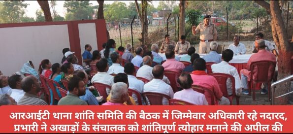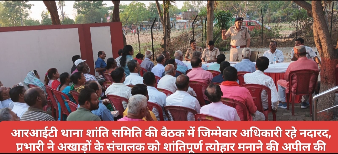 Saraikela (संजीव मेहता) : बुधवार की शाम आरआईटी थाना शांति समिति की बैठक थाना प्रभारी विनय कुमार की अध्यक्षता में सम्पन्न हुई. खास बात यह रही कि बैठक में जिम्मेवार अधिकारी नदारद रहे. नगर निगम और जिला प्रशासन के अधिकारी नहीं पहुंचे, जिनके बारे में बताया गया है नीति आयोग की टीम के दौरे के वजह से वे नहीं आ सके. बावजूद थाना प्रभारी ने अखाड़ों के संचालक के साथ बैठक की और उनकी समस्याओं को सुना. यहां 6 लाइसेंसी और 2 गैर लाइसेंसी रामनवमी अखाडा कमेटी हैं जो 7 अप्रैल को विधिवत जुलूस निकालेंगे. अखाड़ा कमेटी के द्वारा थाना प्रभारी से सड़कों की मरम्मती, स्ट्रीट लाइटों को दुरुस्त कराने, अखाड़ा के पास पानी टैंकर उपलब्ध कराने की मांगों को रखा. थाना प्रभारी ने सभी अखाड़ा संचालकों को शांतिपूर्ण तरीके से रामनवमी का त्योहार मनाने और जुलूस निकालने की अपील की.