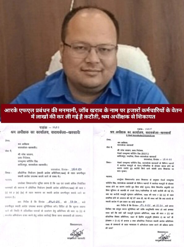 संवाददाता को भी जानकारी मिल रही है कि आरकेएफएल के आदित्यपुर, गम्हरिया, और सरायकेला- खरसावां जिले के विभिन्न प्लांट में कार्यरत हजारों मजदूरों से प्रोडक्ट में खराब होने के नाम पर वेतन में भारी कटौती की गई है. जब बारे में जब श्रम कानून की जानकारी रखने वाले विभिन्न दलों से सम्बद्ध नेताओं ने कहा कि यह एक Illegal Labour Practice है. किसी भी प्रोडक्ट के खराब होने के कारण उसकी कीमत के नुकसान की भरपाई कर्मचारियों के वेतन से कटौती कर के करना श्रम कानूनों का घोर और स्पष्ट उल्लंघन है. साथ ही कंपनी के स्टैंडिंग ऑर्डर के प्रावधानों का भी उल्लंघन है. यह कंपनी प्रबंधन के घोर मनमानी और अनियमितता का उदाहरण है. वे लोग मजदूरों को अवश्य न्याय दिलाएंगे. इधर इस संबंध में जानकारी प्राप्त करने के लिए जब कंपनी के अधिकारियों से बात करने का प्रयास किया गया तो वे मोबाइल नहीं उठाए.वही पूरे मामले को गंभीरता से लेते हुए श्रम अधीक्षक अविनाश ठाकुर ने श्रम विभाग द्वारा मजदुरी भुगतान अधिनियम 1936, आधुनिक विवाद अधिनियम 1947 एवं स्थायी आदेश अधिनियम 1946 के तहत स्पष्टीकरण निर्गत करते हुए अगले 24-06-2025 तक जबाब कंपनी प्रबंधन से मांगा है