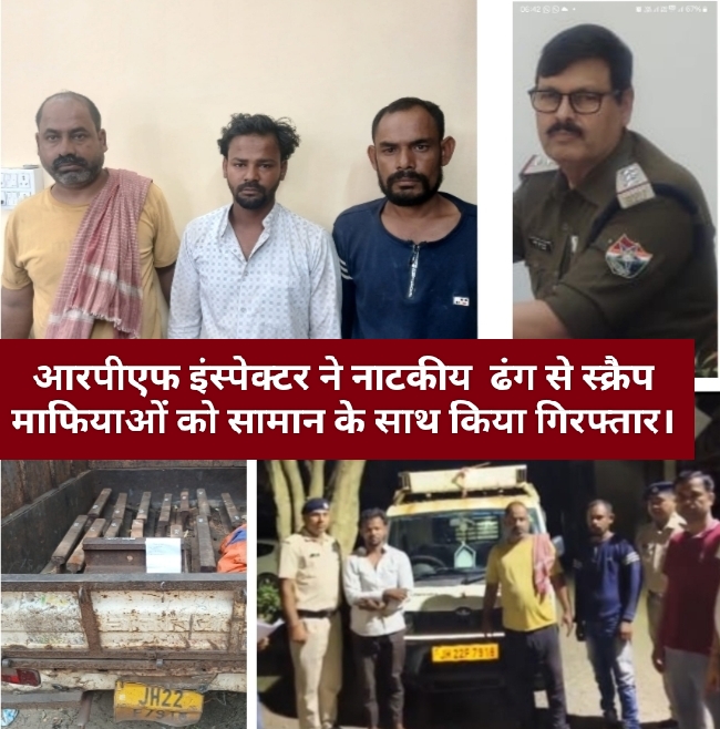 आदित्यपुर रेल संपत्ति की सुरक्षा में तैनात आदित्यपुर आरपीएफ पोस्ट की सतर्कता और सुरक्षा निगरानी के तहत स्क्रैप माफियाओं द्वारा घटना की अंजाम देने से पूर्व ही नाटकीय ढंग से आरपीएफ इंस्पेक्टर ए के सिंह ने समान सहित माफियाओं को गिरफ्तार कर लिया और उन्हें जेल के सलाखों के पिछे भेज दिया है। इस कार्रवाई से स्क्रैप माफिया गिरोह का भंडाफोड़ करते हुए तीन आरोपियों को चोरी करते रंगे हाथ गिरफ्तार किया गया। सभी 407 ट्रक जेएच 22एफ/7918 पर सवार थे। गिरफ्तार मुख्य आरोपी वरुण सिंह, बागबेड़ा गाढ़ावासा का रहने वाला है। जिसे कई थाने के पुलिस से ढूंढ रही है । जिसका गम्हरिया के उषा मोड़ में अवैध रूप से स्क्रैप टाल चलता है। गम्हरिया घोड़ा बाबा मंदिर के पास भी स्क्रैप टाल था। जहां कई बार घटनाएं भी घट चुकी है। पुलिस ने उसके दो साथी जुगसलाई के गरीब नवाज कॉलोनी निवासी मो आरजू और कोलाबीरा (सरायकेला) निवासी पत्रा लाल को गिरफ्तार तीनों