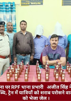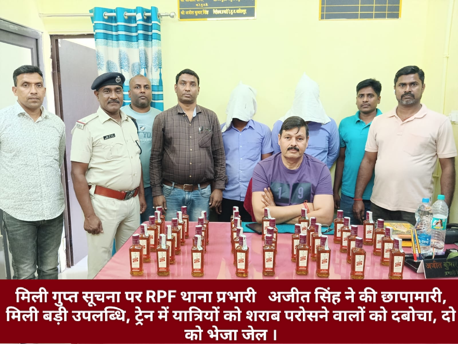 मिली गुप्त सूचना पर RPF थाना प्रभारी अजीत सिंह ने छापामारी की जिसमें, बड़ी उपलब्धि हासिल हुई है ।, ट्रेन में यात्रियों को शराब परोसने वालों को नाटकीय ढंग से जाल बिछाकर दबोचा, और दो को जेल भेज दिया है ।