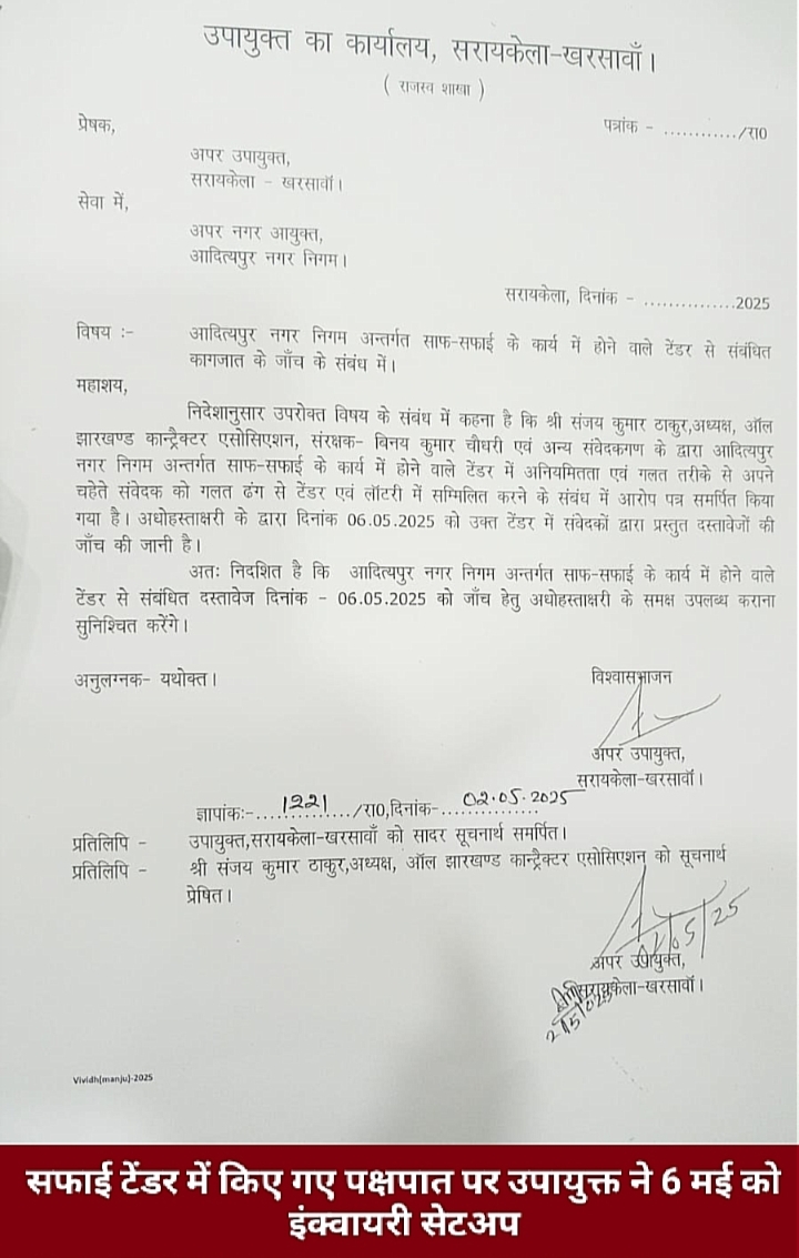 सरायकेला (संजीव मेहता) : सफाई टेंडर में किए गए पक्षपात पर उउपायक्त ने 6 मई को इंक्वायरी सेटअप किया है. अपर उपायुक्त रवि प्रकाश ने विभिन्न ग्रुप में सभी अपने संवेदकों को टेंडर कर दिया है. जब सभी संवेदकों को पता चला तो झारखंड कॉन्ट्रैक्टर एकजुट होकर एक बैठक की और सरायकेला जाकर उपायुक्त से शिकायत कर दिया है. उपायुक्त ने 6 मई को टेंडर पेपर की जांच का आदेश दिया है.