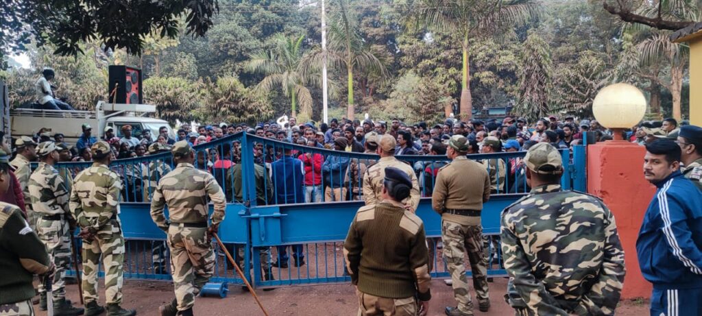 वही सेल प्रबंधन ने प्रदर्शन करने वाले लोगों से निपटने के लिए सीआईएसएफ के जवान तथा झारखंड पुलिस को सुरक्षा के पुख्ता इंतजाम पहले से कर रखे थे। वही इस आंदोलन को लेकर किरीबुरु के इंस्पेक्टर बिरेंद्र एक्का भी गुवा सेल जेनरल ऑफिस पहुंच मोर्चा को संभाले हुए थे। ज्ञात हो कि बुधवार को दूसरे राज्य से 18 लोगों को सेल प्रबंधन द्वारा गुवा सेल में जॉइनिंग दी गई है। और यहां के स्थानीय युवा बेरोजगारों को सेल प्रबंधन नौकरी ना देकर दरकिनार कर दिया गया है। संयुक्त यूनियनों में झारखंड मजदूर संघर्ष संघ के केंद्रीय अध्यक्ष रामा पांडे, बोकारो स्टील वर्कर्स यूनियन इंटक के क्षेत्रीय महामंत्री दुचा टोप्पो, सारंडा मजदूर यूनियन के महामंत्री राजकुमार झा, झारखंड मुक्ति मोर्चा यूनियन के अध्यक्ष पंचम जॉर्ज सोय, सीटू के अध्यक्ष मनोज मुखर्जी, सप्लाई मजदूर संघ के अध्यक्ष राजेश कोड़ा ने अपनी मांगों को लेकर गुवा सेल प्रबंधन को मांग पत्र सौंपा। सबो ने मांग पत्र में लिखा कि गुवा खदान आदिवासी बहुल क्षेत्र के सारंडा जंगलों के बीच बसा हुआ है। यहां के स्थानीय वासी राष्ट्रहित एवं उद्योगहित के लिए अपनी कृषि युक्त भूमि का त्याग कर स्वयं बेरोजगारी के कगार पर खड़े हैं। स्थानीय एवं आसपास के ग्रामीण बेरोजगारों के लिए रोजगार का एकमात्र विकल्प गुवा खदान ही है। गुवा सेल प्रबंधन बाहरी युवकों का नियुक्ति कर यहां के स्थानीय बेरोजगार युवकों के अधिकारों का हनन कर रही है। अगर सेल प्रबंधन बाहरी युवकों की बहाली को निरस्त नहीं करता है तो यह आंदोलन को जारी रखते हुए सांसद गीता कोड़ा के दिशा निर्देशन में बैठकर आगे की रणनीति बनाते हुए और भी कड़ा रूप अख्तियार की जाएगी।