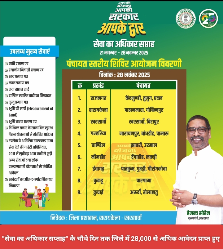 Saraikela (संजीव मेहता): “सेवा का अधिकार सप्ताह” के चौथे दिन जिले के 19 ग्राम-पंचायतों एवं नगर निकाय क्षेत्र के विभिन्न वार्डों में विशेष पंचायत स्तरीय शिविरों का आयोजन किया गया. शिविरों में ग्रामीणों की व्यापक एवं उत्साहपूर्ण सहभागिता देखने को मिली और बड़ी संख्या में नागरिक विभिन्न सेवाओं तथा कल्याणकारी योजनाओं से संबंधित आवेदन जमा कर रहे हैं.अब तक जिले में 28,000 से अधिक आवेदन प्राप्त हो चुके हैं.
