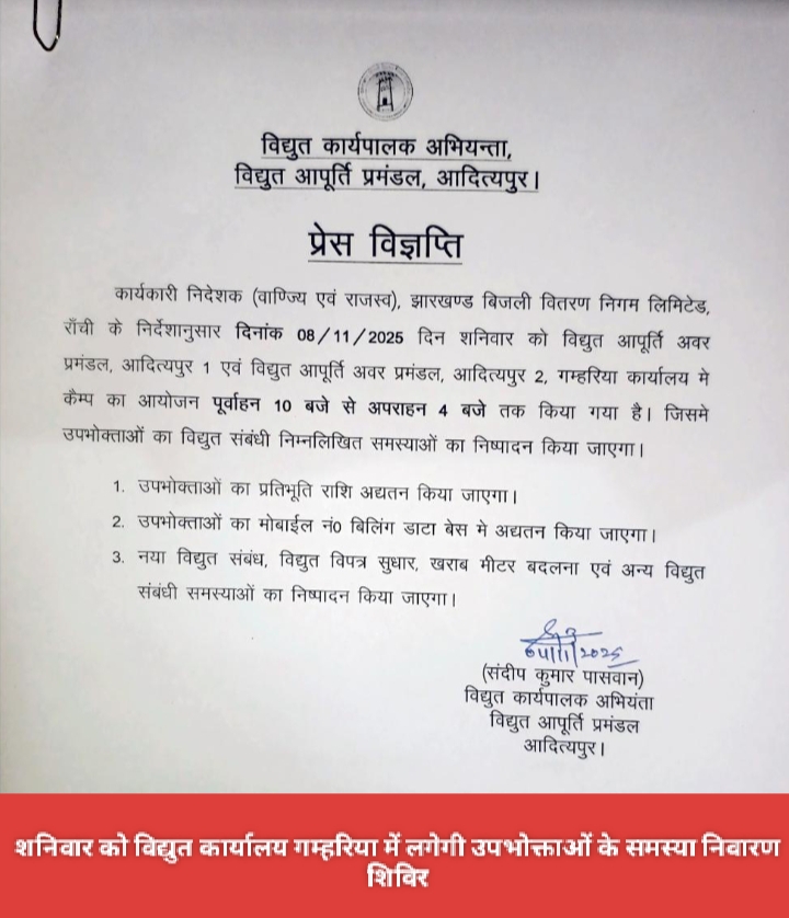 Saraikela (संजीव मेहता) : शनिवार को विद्युत कार्यालय गम्हरिया में उपभोक्ताओं के समस्या निवारण हेतु शिविर लगाई जाएगी. यह जानकारी विद्युत कार्यपालक अभियंता संदीप कुमार पासवान ने दी. उन्होंने बताया कि कार्यकारी निदेशक (वाण्ज्यि एवं राजस्व) झारखण्ड बिजली वितरण निगम लिमिटेड, राँची के निर्देशानुसार दिनांक 08/11/2025 दिन शनिवार को विद्युत आपूर्ति अवर प्रमंडल, आदित्यपुर 1 एवं विद्युत आपूर्ति अवर प्रमंडल,