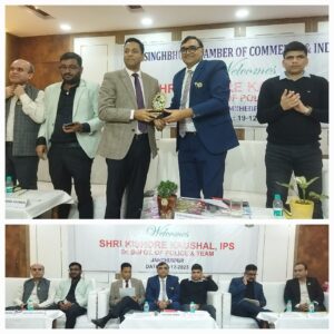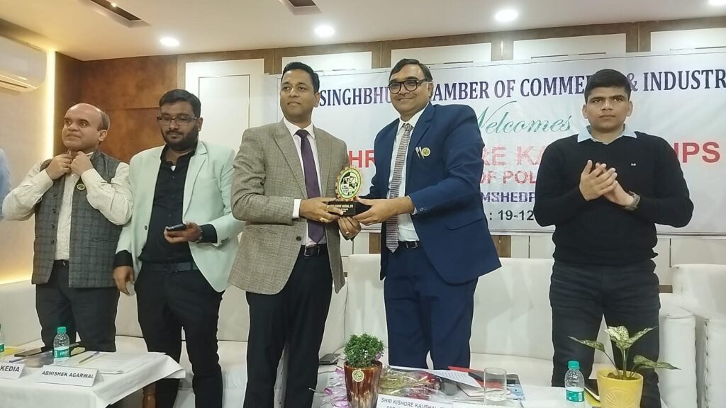 जमशेदपुर : जमशेदपुर में विधि व्यवस्था को लेकर सिंहभूम चैंबर ऑफ कॉमर्स एंड इंड्रस्टीज और जिला पुलिस प्रशासन के बीच सीधा संवाद का आयोजन जमशेदपुर के बिष्टुपुर चेंबर भवन में आयोजित किया गया। सिंहभूम चैंबर ऑफ कॉमर्स एंड इंड्रस्टीज के विजय आनंद मुनका के दूसरे सत्र के अध्यक्ष बनने के बाद पहली बार सिर्फ व्यवसायियों के लिये नही बल्कि पूरे जिले के विधिव्यवस्था और सुरक्षा को लेकर व्यवसायियों और जिला पुलिस के साथ सीधा संवाद का आयोजन किया गया ।