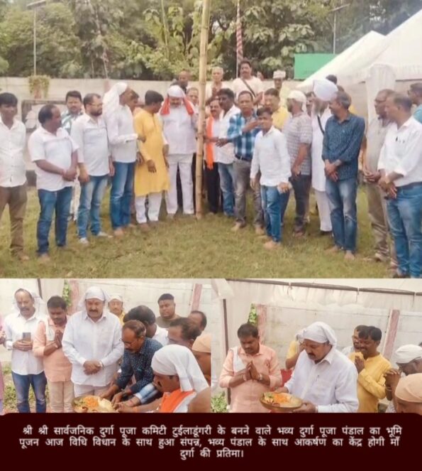 जमशेदपुर : श्री श्री सार्वजनिक दुर्गा पूजा कमिटी टुईलाडूंगरी के बनने वाले भव्य दुर्गा पूजा पंडाल का भूमि पूजन आज विधि विधान के साथ पंडित निरंजन रथ और पंडित प्रदिप्त कुमार दास के देख रेख में संपन्न हुवा, पूजा कमिटी के मुख्य संरक्षक राजू गिरी, अध्यक्ष मिथिलेश सिंह यादव और महासचिव दिनेश कुमार ने संयुक्त रूप से पूजा अर्चना की, महासचिव दिनेश कुमार ने बताया की देश की आजादी के पहले 1934 से होने वाली यह पूजा शहर में पहले उड़िया पूजा के रूप में प्रसिद्ध थी,