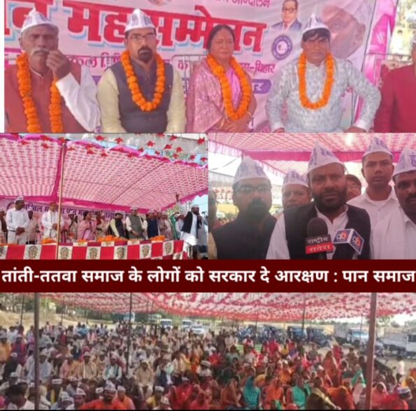 पान समाज (तांती-ततवा) समाज को फिर से आरक्षण देने की आवाज बुलंद की।लोगों ने सरकार के खिलाफ आक्रोश जताते हुए आरक्षण वापसी करने की मांग की।राष्ट्रीय अध्यक्ष आईपी गुप्ता ने कहा कि 13 अप्रैल को पटना के गांधी मैदान में महारैली होनी है, इसमें 85 लाख पान समाज के लोग शामिल होकर अपनी जायज मांगों की आवाज बुलंद करेंगे। जो पार्टी आरक्षण देने की बात कहेगी उसका समर्थन किया जायेगा।पान समाज सिर्फ नारे लगाने के लिए नहीं, बल्कि सत्ता में अपनी भागीदारी सुनिश्चित कराने व आरक्षण वापसी करने के लिए मैदान में उतरा है.
