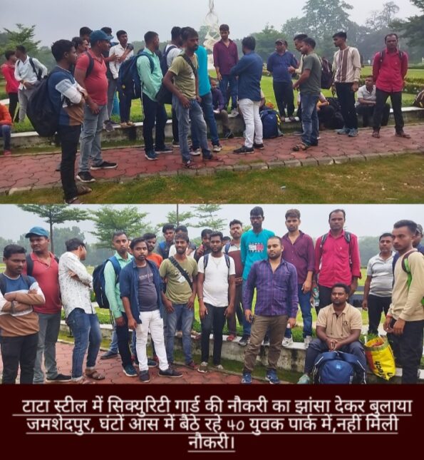 ऐसा ही नजारा सोमवार को जमशेदपुर में देखने को मिला जब झारखंड और पश्चिम बंगाल से 40 से 50 युवक रोजगार मिलने के आस में सुबह 10 बजे शहर पहुंच गए,उन्हें बताया गया कि वे लोग जुबली पार्क पहुंचे वहां से उन्हें कार्य स्थल पर ले जाया जाएगा। युवाओं का कहना था कि सभी को टाटा स्टील के अधीन सिक्योरिटी गार्ड की नौकरी दी जाने की जानकारी दी गई, जिनका वेतन 17 हजार होगी,इसी झांसे में आकर सभी पहुंच गए जहां शाम 5 बजे तक संबंधित एजेंसी के द्वारा बरगलाते रहे अंत में सभी अपने को ठगा महसूस कर वापस लौटने लगे लेकिन कई के पास खाने और घर लौटने तक के पैसे तक नहीं थे।