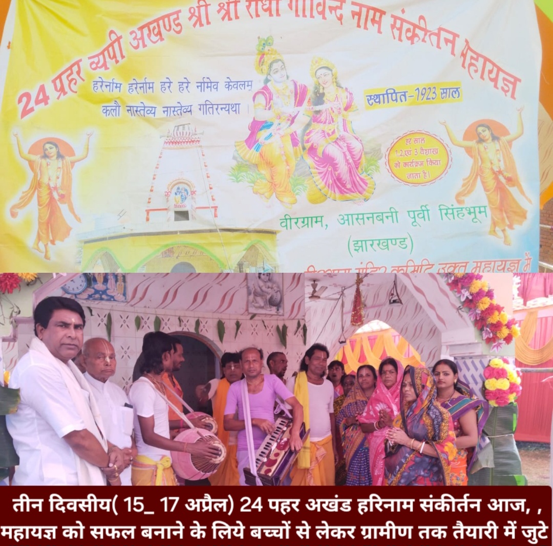 जादूगोड़ा : जादूगोड़ा थाना अंतर्गत वीरग्राम में तीन दिवसीय( 15_ 17 अप्रैल) 24 पहर अखंड हरिनाम संकीर्तन कल मंगलवार से शुभारभ होगा।जिसको लेकर बच्चों से लेकर ग्रामीण तक तक तैयारी में जुटे है।इधर कार्यक्रम के बाबत आदिम झारखंड वैष्णव बैरागी समिति के अध्यक्ष सह आयोजक सुंदर लाल दास ने कहा कि इस महायज्ञ में पुरुलिया, बांकुड़ा से कीर्तन संप्रदाय माहौल को भक्तिमय बनाएंगे ।