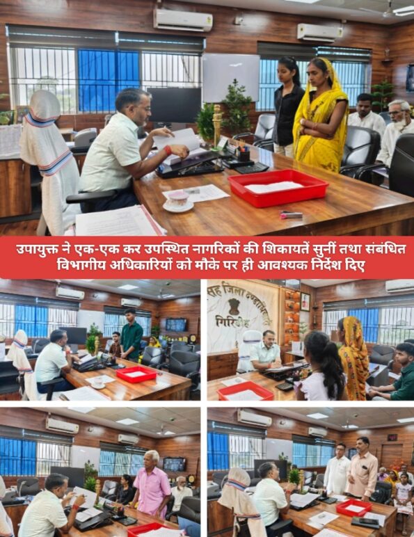 गिरिडीह : जिला उपायुक्त रामनिवास यादव ने अपने कार्यालय कक्ष में जनता दरबार का आयोजन किया। जनता दरबार में जिले के विभिन्न प्रखंडों से आए आम नागरिक उपस्थित हुए और अपनी समस्याएं उपायुक्त के समक्ष रखीं। उपायुक्त ने एक-एक कर उपस्थित नागरिकों की शिकायतें सुनीं तथा संबंधित विभागीय अधिकारियों को मौके पर ही आवश्यक निर्देश दिए।