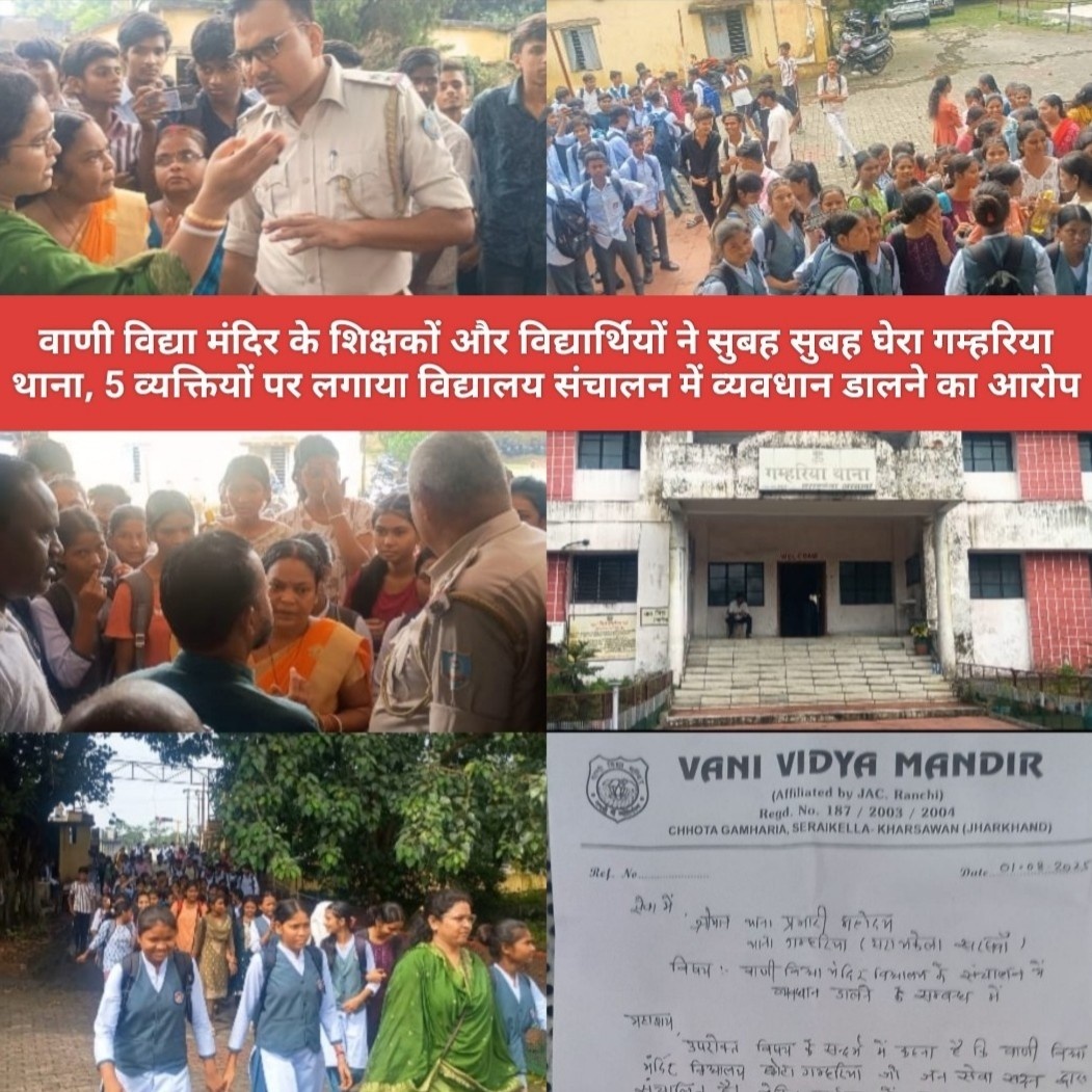 वाणी विद्या मंदिर के शिक्षकों और विद्यार्थियों ने शुक्रवार को सुबह सुबह गम्हरिया थाना पर प्रदर्शन करते हुए थाना का घेराव किया. विद्यालय के लिपिक युद्ध पति महतो ने लिखित शिकायत में 5 व्यक्तियों पर विद्यालय संचालन में व्यवधान डालने का आरोप लगाया है. जिनमें चन्द्रनाथ महतो, वरुण चंद्र महतो, अमीन महतो, पप्पू महतो एवं बसंत महतो एवं अन्य शामिल हैं.