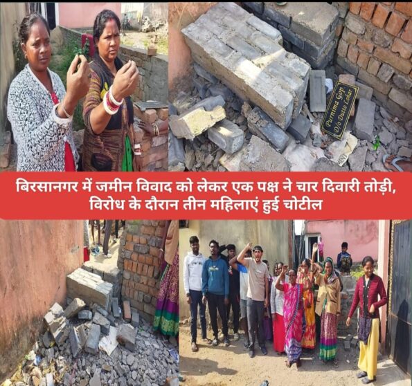 बावजूद सोमवार को रमेश कुछ महिलाओं और मजदूरों को लेकर पहुंचा और चारदीवारी तोड़ने लगा जिसका विरोध करने पर महिलाओं के साथ मारपीट करते हुए जाति सूचक शब्दों का इस्तेमाल किया गया इस दौरान तीन महिलाएं चोटिल हो गई। वहीं सूचना पर बिरसानगर थाना पुलिस पहुंची लेकिन पीड़ित परिवारों का आरोप है कि पुलिस दूसरे पक्ष का समर्थन करते हुए पड़ोसी सन्नी सिंह को झूठे मामला में फसाने की धमकी देने लगे जिसे लेकर काफी देर तक को हंगामा होता रहा यह देख स्थानीय वासी जुटने होने लगे, मामले की गंभीरता को देख पुलिस दोनों पक्षों को कागजात लेकर थाना आने के बात कह वापस लौट गई। इधर पीड़ित परिवार, रमेश और पुलिस के खिलाफ एससी एसटी थाना में और एसएसपी से शिकायत करने की बात कही है।