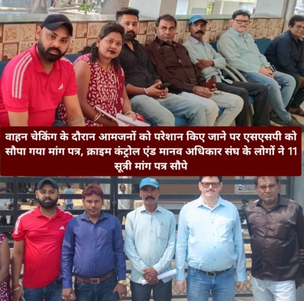 सौंपे गए मांग पत्र में मुख्य रूप से आए दिनों वाहन चेकिंग के दौरान वाहन चेकिंग का बहाना बनाकर आमजनों को बेवजह परेशान करने, वाहन चेकिंग के दौरान पुलिसकर्मी के द्वारा अचानक वाहन चालक को दौड़ाकर पकड़ना, वाहन से जबरन चाबी निकालना, ऑन द स्पोर्ट फाइन नहीं करके वाहन को थाना में लगाकर पैसा की वसूली करना, वाहन चेकिंग के दौरान सरकार के द्वारा जारी गाइडलाइन को पुलिस कर्मियों के द्वारा पालन नहीं किए जाना, पैरवी एवं पैसा देकर लगातार पुलिस कर्मियों के द्वारा वाहन छोड़ने की प्रक्रिया एवं वहीं दूसरी तरफ आमजनों के साथ फाइन करके पैसा वसूली करने की प्रथा को समाप्त करने, शहर में लगातार जाम व्यवस्था को दुरुस्त करने, पुलिसकर्मियों के द्वारा छुपकर अचानक चलती वाहन के दौरान आगे खड़ा होकर वाहन चालक को पकड़ने पर प्रतिबंध लगाते हुए वैसे पुलिसकर्मियों पर कार्रवाई करने, ट्राॅफिक पुलिसकर्मियों के द्वारा सिर्फ दो पहिया वाहन का ही चेकिंग कर उनके साथ सौतेलापन का व्यव्हार करना शामिल हैं. वरीय आरक्षी अधीक्षक ने मामले से अवगत होकर संबंधित जनहित से संबंधित मुद्दों पर कार्रवाई करने का आश्वासन दिया है. प्रतिनिधि मंडल में मुख्य रूप से क्राइम कंट्रोल एंड मानव अधिकार संघ के कोल्हान प्रमंडल अध्यक्ष सुनील गुप्ता, चैयरमैन मनजीत, सचिव महावीर साहू, जांच मंत्री पिंटू अग्रवाल, उप संगठन मंत्री सत्यवीर सिंह, प्रचार मंत्री सुनील, सदस्य अनील सिंह,दिलीप गुप्ता, पूनम देवी शामिल थे.