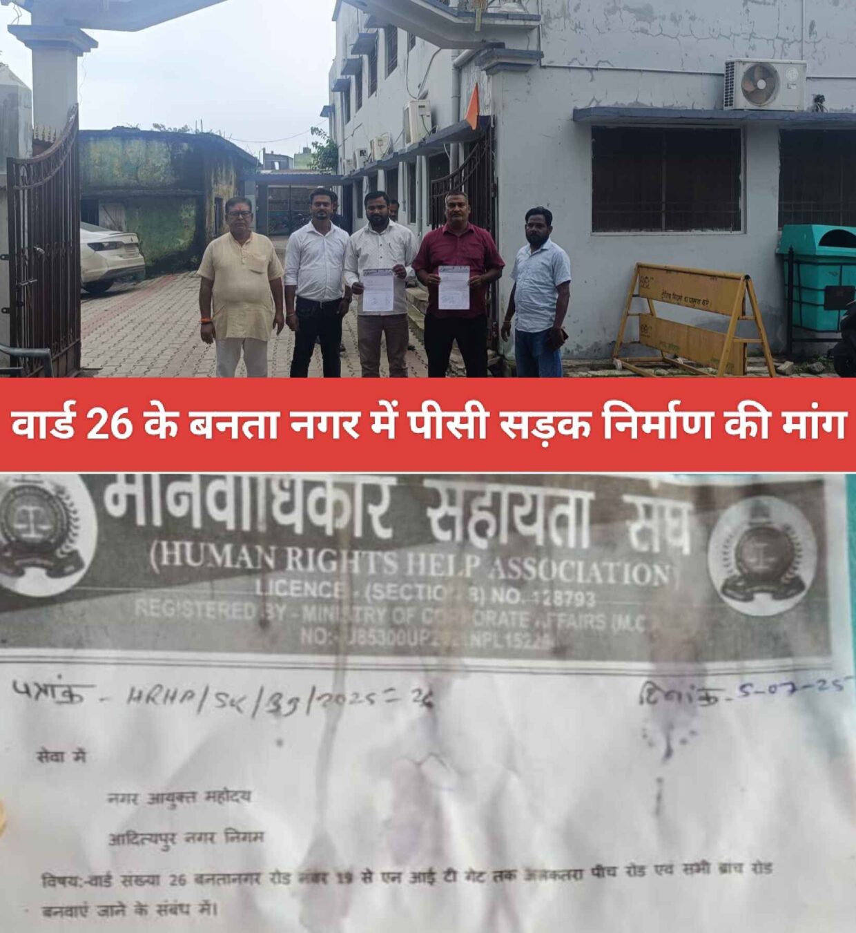 नगर निगम के अन्य वार्डों की तरह वार्ड संख्या 26 के बनतानगर में भी पीच सड़क निर्माण की मांग होने लगी है. चूंकि अब तक मुख्य रोड एवं ब्रांच रोड को अलकतरा पीच नहीं किया गया है, अतः इसे बनाने हेतु मानवाधिकार सहायता संघ आगे आया है. शनिवार को संघ के जिला सचिव बिट्टू ऊर्फ सत्य प्रकाश राय के नेतृत्व में आदित्यपुर नगर निगम कार्यालय में संघ के लोगों ने नगर आयुक्त के नाम एक ज्ञापन सौंपा है.