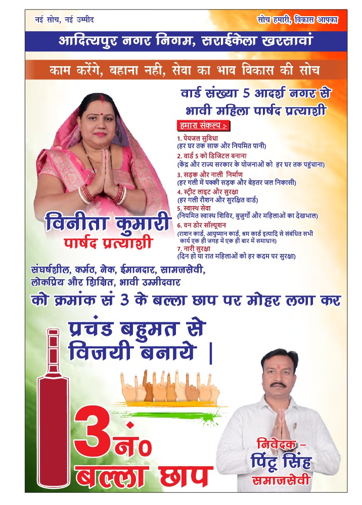 Saraikela : आदित्यपुर नगर निगम के वार्ड नंबर 5 के लिए प्रबल दावेदार विनीता कुमारी ने रविवार को अपना संकल्प पत्र जारी किया. उन्होंने संकल्प पत्र में वन डोर सॉल्यूशन का वादा वार्ड की जनता से की है.